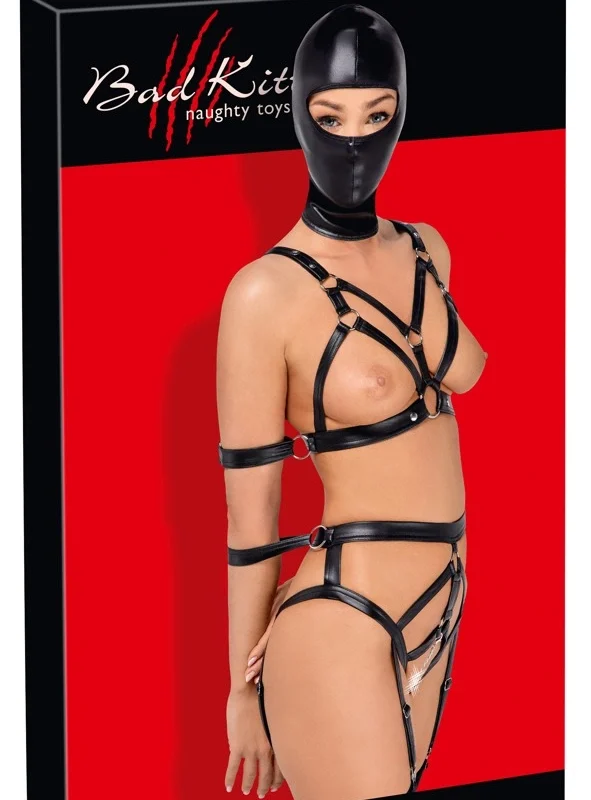 Discover the Bad Kitty Strap & Mask Set XL – an innovative and versatile harness kit crafted for those who appreciate bold design and customizable fit. This exclusive set includes an adjustable chest harness, a strap thong with detachable chain, four secure arm cuffs, and a stylish head mask, all crafted from premium black vegan leather.