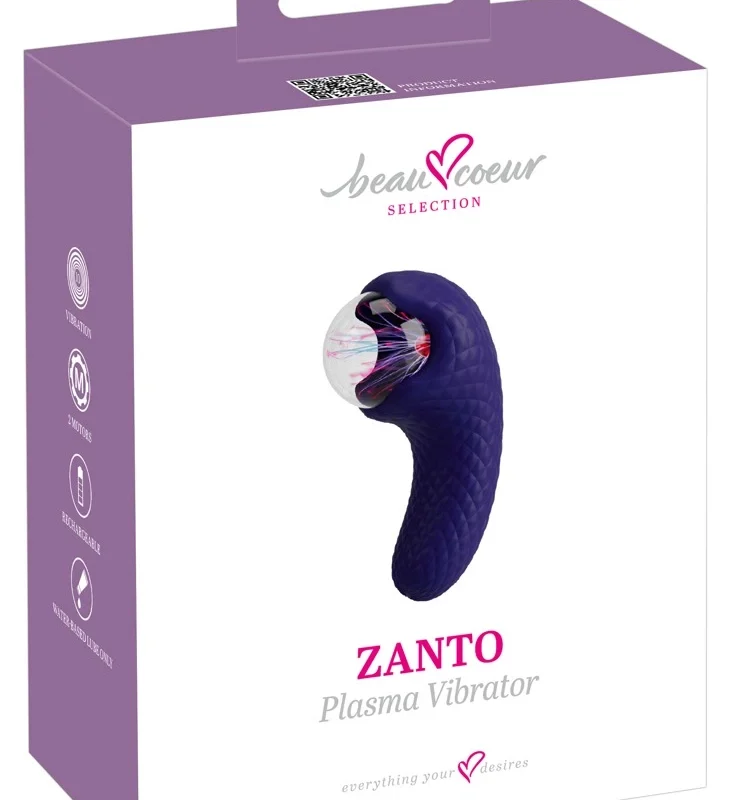 Discover the innovative fusion of technology and design with the beau coeur Zanto Plasma Dual-Ended Vibrator. This advanced personal wellness device features powerful vibrations at both ends, combined with a mesmerizing glass plasma ball that illuminates upon skin contact, creating a visually captivating effect during use.