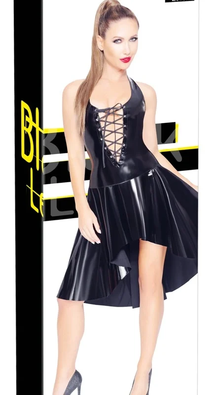 Crafted from high-quality materials, the dress combines a soft polyester base with a polyurethane coating for an exceptional glossy finish and increased durability. This garment is ideal for those who appreciate statement pieces and distinctive fashion.