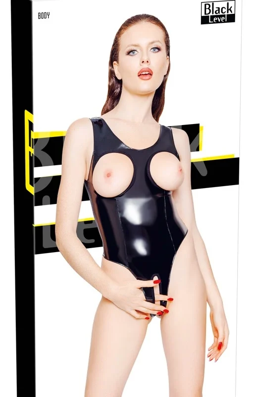 This unique model is crafted from high-gloss black vinyl, delivering a striking, modern look. Designed with two stretchable, anatomically shaped cut-outs at the front, this body accentuates the natural silhouette while allowing for personalisation of fit and coverage. The open crotch area ensures ergonomic comfort and ease of movement. The body includes a full-length back zipper, making dressing and undressing effortless and convenient.