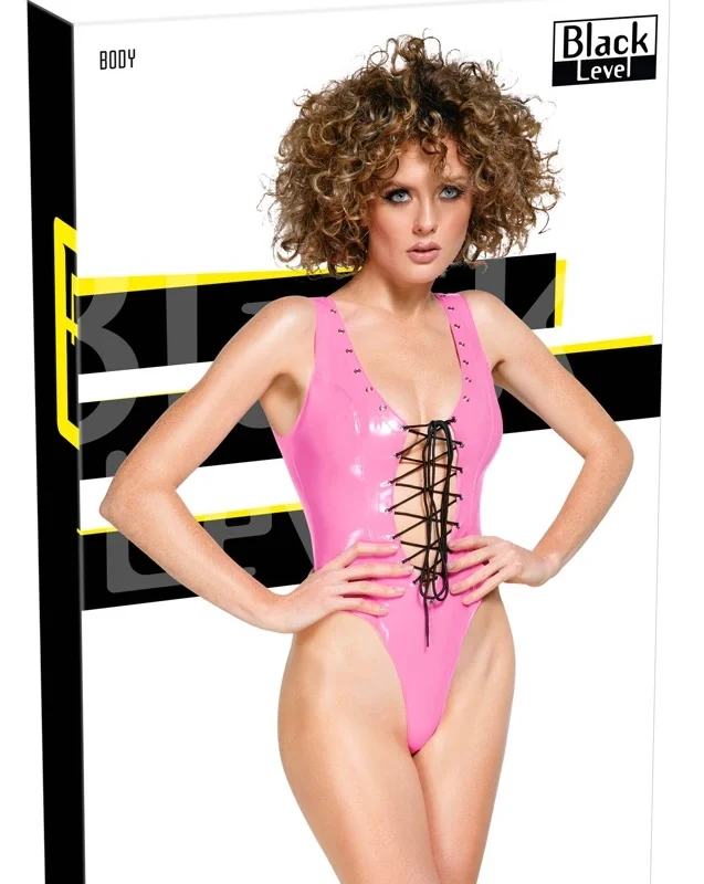 Experience a bold and modern look with this striking short vinyl body by Black Level, presented in an eye-catching pink hue. Designed for those who appreciate contemporary style, this model features a low-cut front and back, accentuated by elegant black lacing threaded through silver-coloured metal eyelets. The adjustable lace-up system at both the front and back allows for a custom fit, ensuring comfort and optimal support.