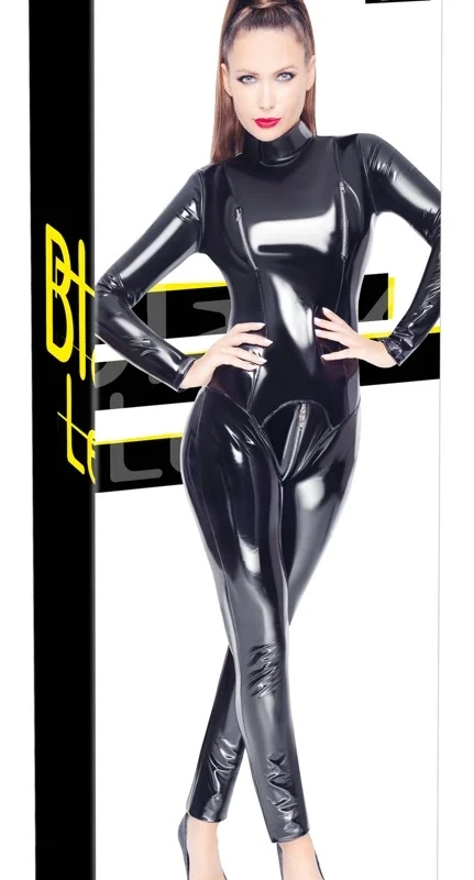 Additional zippered sections are positioned over the chest area, each padded for extra comfort and quick access. The long sleeves and legs enhance the bodysuit’s striking appearance, while the smooth vinyl surface creates a contemporary, shiny finish that stands out in any setting. The high-quality polyester base material is coated with polyurethane, making the suit durable, easy to clean, and comfortable to wear for extended periods.