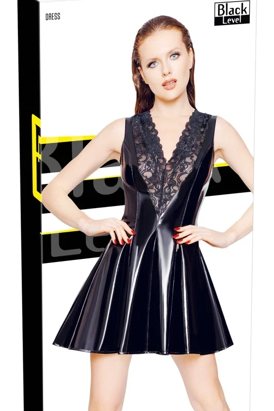 Discover the captivating style of the Black Level Vinyl Dress XL, designed to make a bold impression at any special occasion. Crafted from high-gloss black vinyl, this sleeveless dress features a flattering A-line silhouette that combines a fitted bodice with a gently flared skirt for ease of movement. The standout feature is the elegant v-shaped lace insert positioned above the low-cut neckline, offering a sophisticated accent that enhances the overall design.