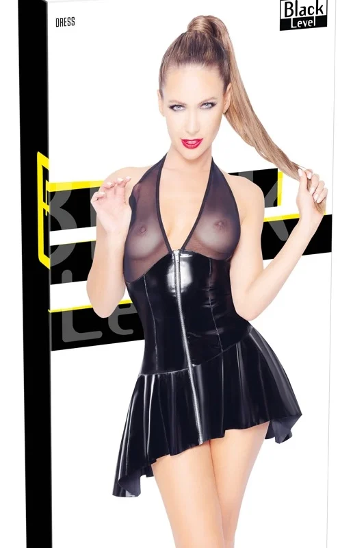 Discover a striking fusion of modern design and bold materials with the Black Level Vinyl Mini Dress in size S. This distinctively styled dress features a captivating contrast: the main body is crafted from sleek, black vinyl, delivering a glossy, eye-catching surface, while the cups and halterneck are made from delicate, powernet mesh for a touch of lightness and subtle transparency.