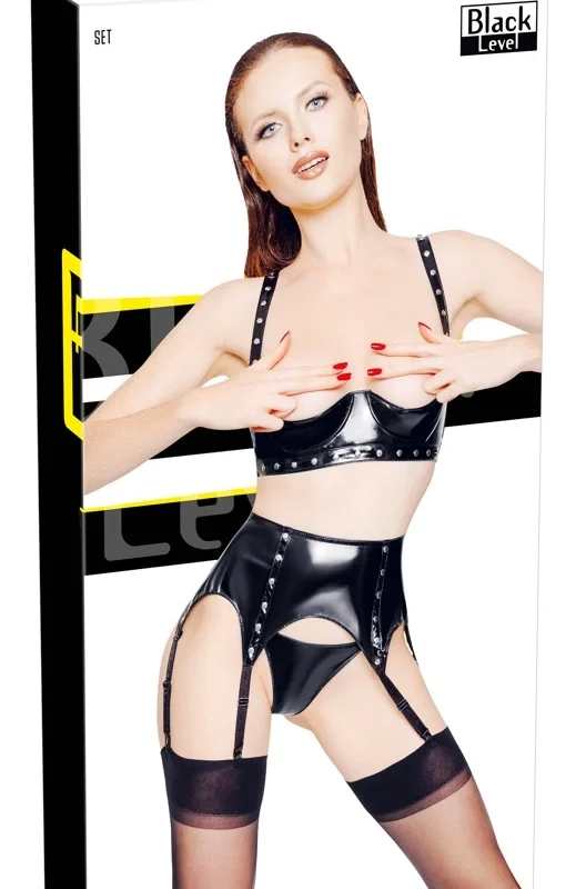 Manufactured from 100% polyester with a durable polyurethane coating, this lingerie set offers both a striking visual effect and long-lasting performance. Please note, the set does not include stockings.