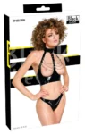 This bold, modern ensemble includes an open cup halterneck top and a matching thong, both crafted from a sleek, high-shine vinyl material. The set is enhanced with silver-coloured metal details and innovative chain accents, adding a unique touch to your personal collection.