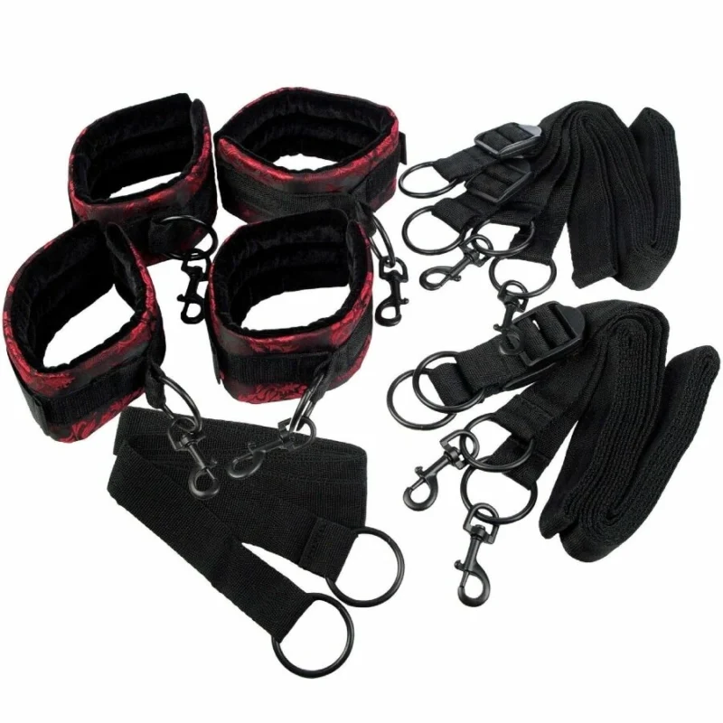Enhance your private moments with the CalExotics Scandal Bed Ties Adjustable Restraint System, a premium solution engineered for both comfort and versatility. Crafted with luxurious red and black brocade fabric and plush interiors, this model is designed to provide secure positioning while ensuring optimal comfort. Its adjustable wrist and ankle cuffs are connected by robust tethers, accommodating any bed size for a seamless fit in any bedroom environment.