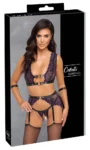 • Set includes: bralette, suspender belt, open thong, two wrist cuffs