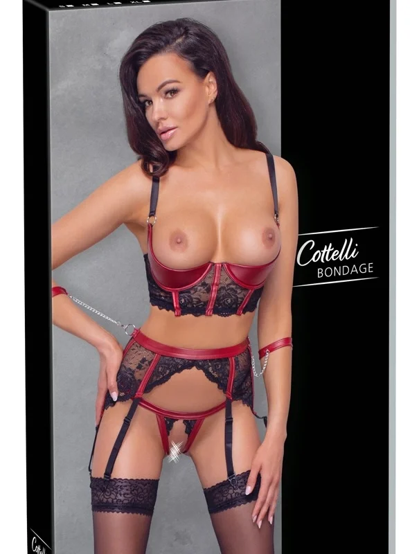 Discover the harmony of elegance and bold design with the Cottelli Bondage Shelf Bra Set in black and red, size S.