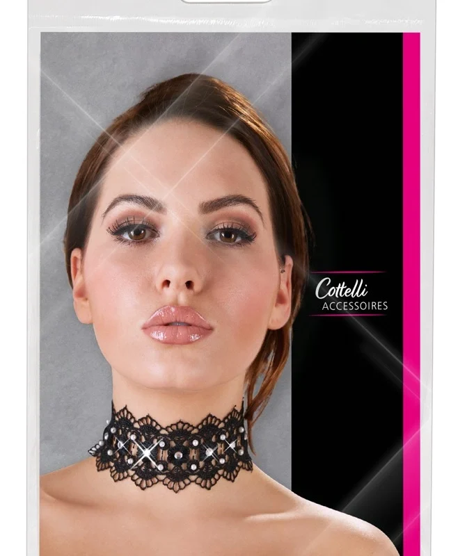 Cottelli Collection Black Embroidered Choker with Pearls and Rhinestones – Elegant Accessory for Special Occasions