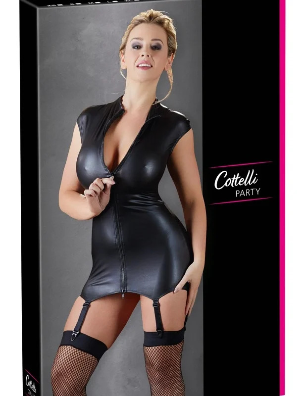 Elevate your wardrobe with this classic and modern mini dress from Cottelli Collection, designed for those who appreciate sophisticated style with an edge. This sleeveless, high-neck dress features a shimmering matte finish that creates a bold and striking appearance. The innovative 2-way zipper at the front allows for versatile styling, offering both convenience and a touch of contemporary flair.