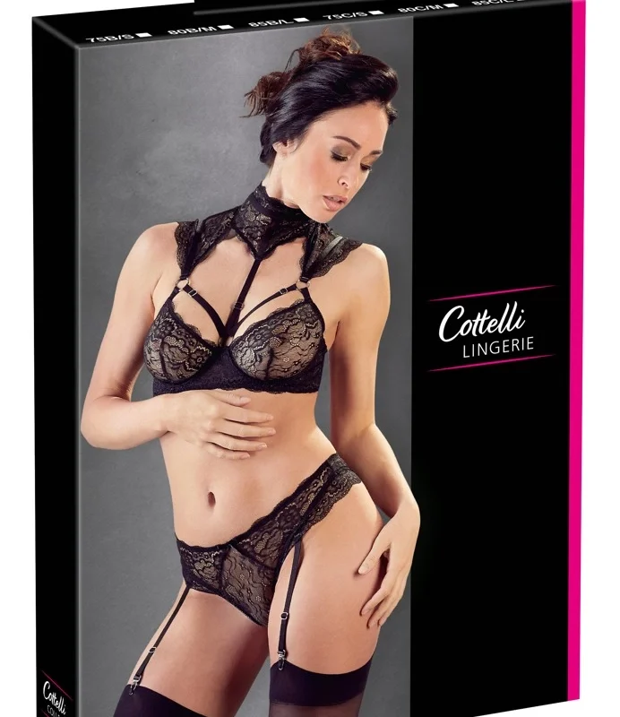 Distinctive lace details extend over the collarbone, integrating seamlessly into a comfortable, wide collar. The bra is secured with a practical hook fastener at the back and two buttons at the collar, ensuring a tailored fit and easy dressing. The included lace string completes the set and features adjustable and removable suspender straps, allowing for versatile styling options.