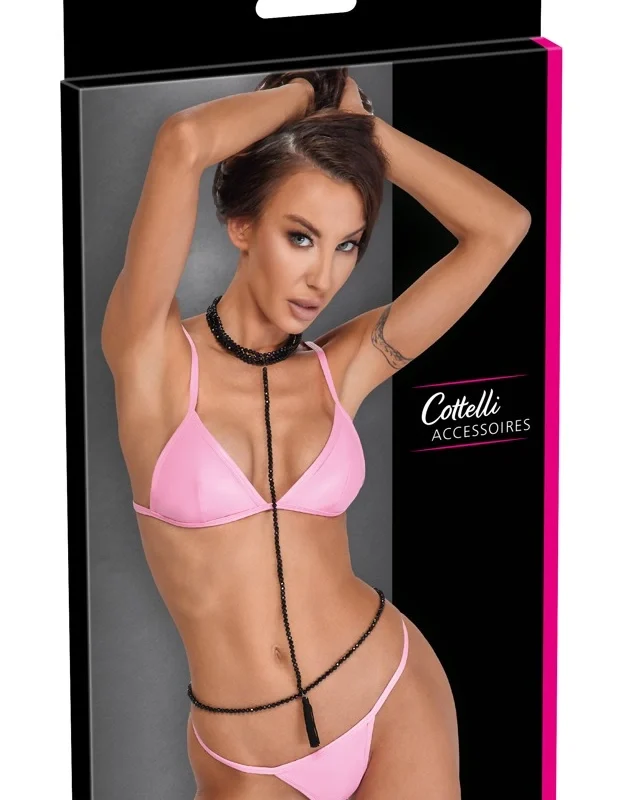 Enhance your style with the sophisticated Cottelli Collection Choker & Bikini Chain Set, designed to combine elegance and modern flair. This unique accessory features three rows of elastic pearls that gracefully embrace the neck, delivering a refined and contemporary look. The choker is seamlessly connected to a delicate bikini chain, crafted with care for both comfort and adjustability. A decorative tassel detail rests over the stomach, adding a subtle touch of charm to the ensemble.