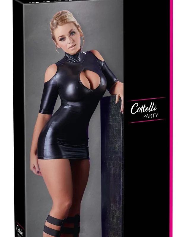 The dress is crafted from a shiny matte wet look material that gently follows the contours of the body for a sleek, streamlined silhouette. The advanced fabric blend – 92% polyester and 8% spandex – ensures comfort, flexibility, and a flattering fit, while the subtle sheen adds a refined touch of glamour.
