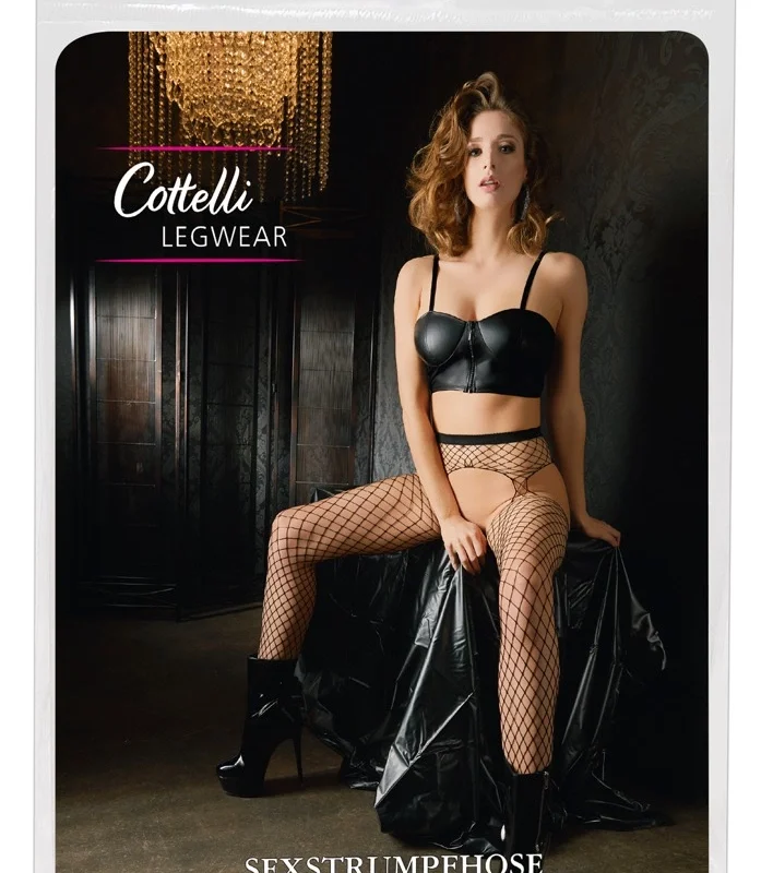 Discover a bold fashion statement with the Cottelli Collection Fence Net Suspender Tights in classic black. Specially designed for those who appreciate unique and stylish wardrobe additions, these tights feature a striking fence net pattern with captivating side cut-outs and an integrated suspender effect. Their sophisticated look pairs effortlessly with dresses, skirts, or layered ensembles, making them a versatile accessory for special occasions or everyday style enhancements.