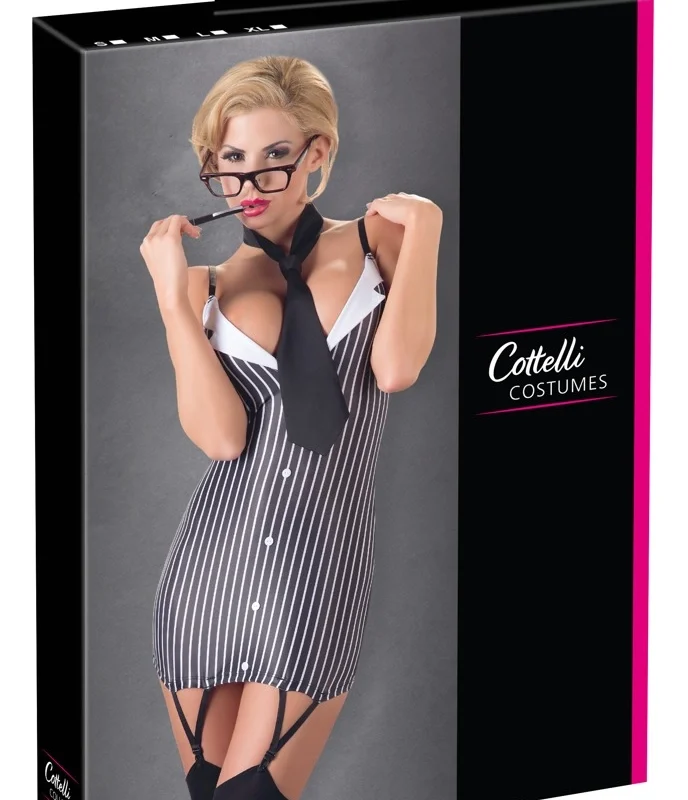 The model is enhanced by adjustable shoulder straps and two frontal suspender straps, allowing for personalized adjustments and a secure fit. Decorative buttons run along the front panel, adding a stylish touch, while a subtle collar frames the neckline for an elegant finish. Included with the dress is a matching tie, completing the professional yet fashionable look.