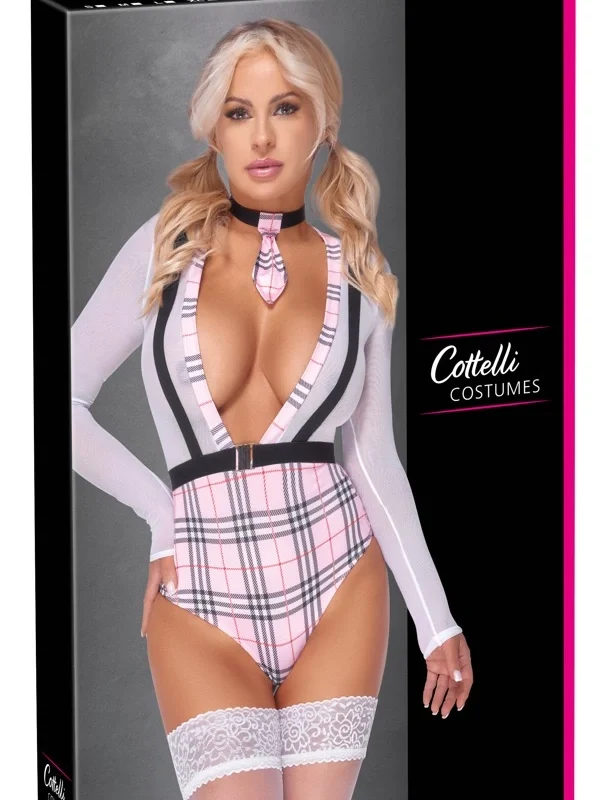 Step into a world of timeless style with this sophisticated Schoolgirl L costume by Cottelli Costumes. Designed in a classic chequered pattern combined with modern transparent accents, this model is perfect for those seeking a blend of tradition and contemporary fashion. The set features an anatomically tailored long-sleeved body and a necktie-style collar, offering both comfort and a striking appearance.