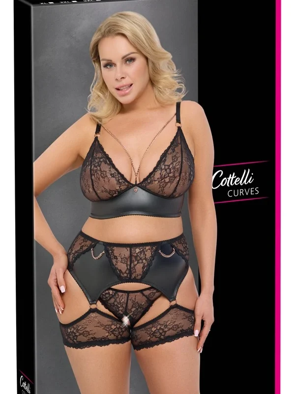 Experience refined elegance and modern design with the Cottelli CURVES 3-Piece Lace Bra Set in classic black, thoughtfully crafted for those who value both style and comfort. This sophisticated set includes an anatomically shaped bra, matching briefs with a distinctive open design, and an adjustable suspender belt, all designed to complement fuller figures.