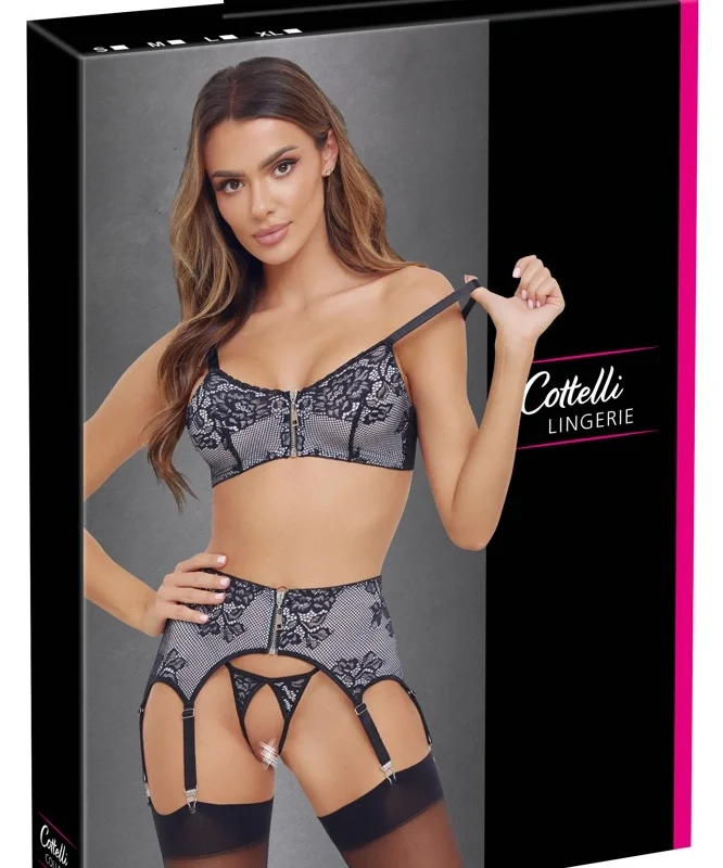 - Three-piece lingerie set: bra, suspender belt, and open thong