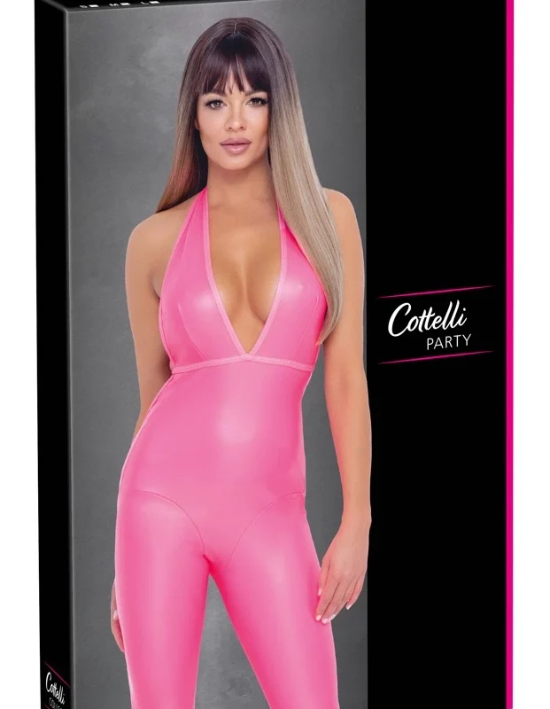 This striking jumpsuit from the renowned Cottelli PARTY collection is crafted from high-quality, neon pink material with a sleek, shiny matte finish. Designed to attract attention, this model features a deep plunging neckline that gracefully extends to the waist, accentuating the upper body. The slim, full-length legs offer a contemporary silhouette, while the adjustable halterneck tie ensures a secure and customizable fit.