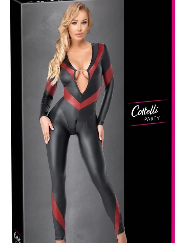 Engineered for a striking, body-hugging fit, this dynamic jumpsuit from the Cottelli PARTY collection is crafted from a high-quality, dual-tone material. Featuring a sleek matte black surface accented by bold red stripes, its refined design adds a modern, energetic edge to your wardrobe.