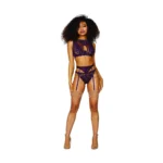 Indulge in refined elegance with the Dreamgirl Aubergine Lace & Mesh 3-Piece Lingerie Set, designed for those who appreciate a blend of sophistication and comfort. This captivating set features a strappy triangle cup bra adorned with a gold-tone center ring, delivering a harmonious balance of modern flair and timeless appeal. The adjustable shoulder straps and back closure ensure a tailored fit, enhancing comfort and support. The ensemble includes a coordinating garter belt crafted from metallic corded stretch lace with fully adjustable garters, allowing for a personalized configuration. Completing the set is a matching lace G-string, seamlessly uniting the look with its delicate craftsmanship. Please note: thigh highs shown are sold separately (Style 0001).