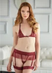 - Complete three-piece set: lace bra, g-string, and garter belt with removable accessories