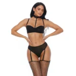 - Includes: Underwire bra with choker collar, thong panty with attached garter straps