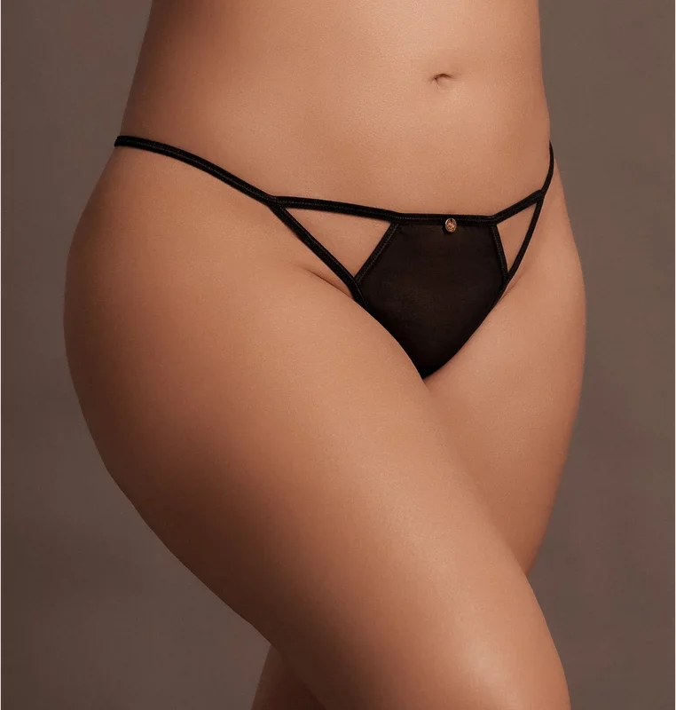 This plus size thong features a semi-transparent mesh front panel, delivering a modern look while maintaining discretion. Adjustable side sliders provide a customizable fit, ensuring the thong adapts seamlessly to your unique contours. The open crotch design introduces a functional element, while subtle golden accents add a touch of luxury and refinement.