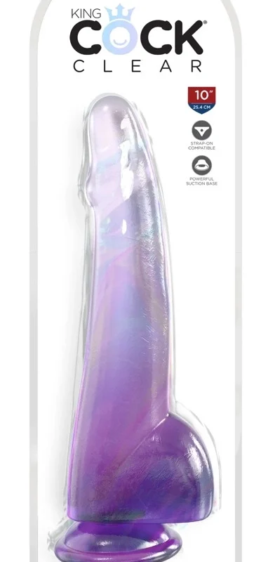 King Cock Clear 10″ Purpl Model with Balls is a premium, transparent intimate device crafted for those who value high-quality design and advanced materials. This model features a detailed, anatomical shape with a prominent head and base, all rendered in a striking, purple-tinted clear finish. Its transparent construction not only provides a modern look but also highlights the carefully designed surface texture, ensuring both visual appeal and optimal functionality.