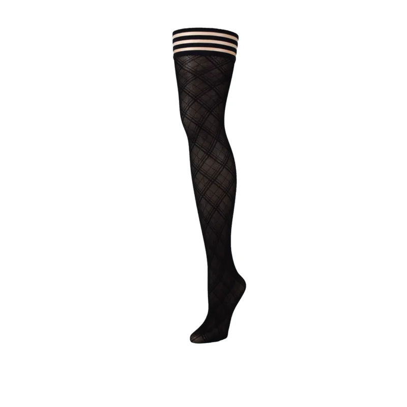 Kix’ies Tiffany Thigh-High Stockings B Black blend sophistication and everyday comfort, featuring an elegant diamond geometric pattern that elevates any wardrobe. Crafted with a semi-sheer finish, these thigh-high stockings offer a modern and refined look, ideal for pairing with a variety of outfits—from chic cocktail dresses to classic skirts.