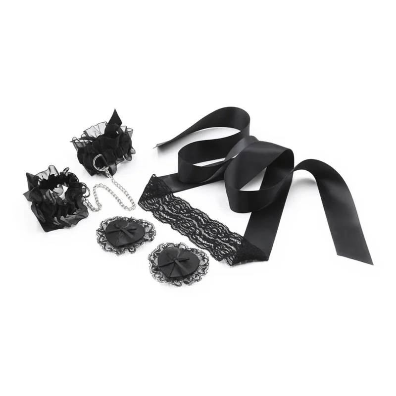 Each element of this set is designed for adjustability and repeated use, ensuring a secure yet gentle fit. The reusable decorative covers offer a subtle touch of charm, while the fully adjustable lace blindfold provides both comfort and sensory intrigue. Completing the set, the soft elastic cuffs feature durable construction for peace of mind during use.
