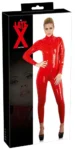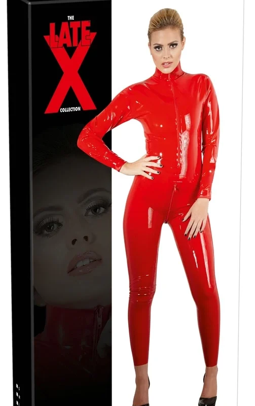 The tailored fit accentuates natural body contours, while the eye-catching red color makes a bold statement. The design features a practical 50 cm front zipper that extends from the neck to the waist, allowing for easy dressing and undressing. An additional discreet zipper runs through the lower section, adding convenience when wearing the suit for extended periods. The catsuit is reinforced with glued seams in the waist area for enhanced durability and comfort.