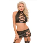 - Set Includes: Faux leather top with crossed straps and matching skirt