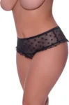 Discover the elegance of the Magic Silk Exposed Mesh Hipster Skirt in 2X Black, designed to combine comfort with stylish visual accents. This model features a modern mesh design adorned with distinctive star patterns, adding a touch of playful character to your wardrobe. The skirted hipster cut is finished with delicate ruffle detailing, offering a visually appealing, feminine silhouette. The open crotch construction introduces functional versatility for select occasions, while the soft, stretchable mesh ensures a comfortable fit for extended wear.