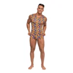 The surface is adorned with a striking multicolored rainbow herringbone pattern, making it a standout piece for any wardrobe. Crafted from lightweight poly-spandex, the fabric offers excellent stretch and breathability, ensuring optimal comfort even during intense activity. Self-binding trim at the shoulders and neckline delivers a refined finish and added durability.