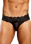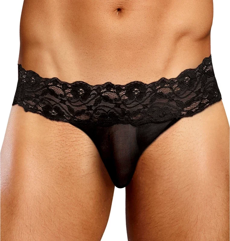 Experience a new level of style and comfort with the Male Power Scandal-Lace Micro Thong in size L/XL, featuring a sophisticated black colorway. This model is designed with a delicate mesh pouch accented by cire trim, offering both breathability and an elegant appearance. The wide, floral lace waistband provides a secure and comfortable fit, ensuring the thong stays in place throughout the day. The unique pinched lace thong back adds a stylish finishing touch, combining modern design with classic elements.