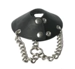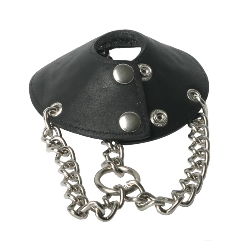Three durable metal chains are affixed to the outer edge of the restraint, converging at a sturdy O-ring. This system allows for the attachment of additional accessories or weights, offering versatile options for personalized use. The leather and metal construction guarantees long-lasting performance and easy cleaning, maintaining the product’s sophisticated look.