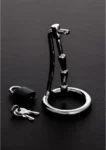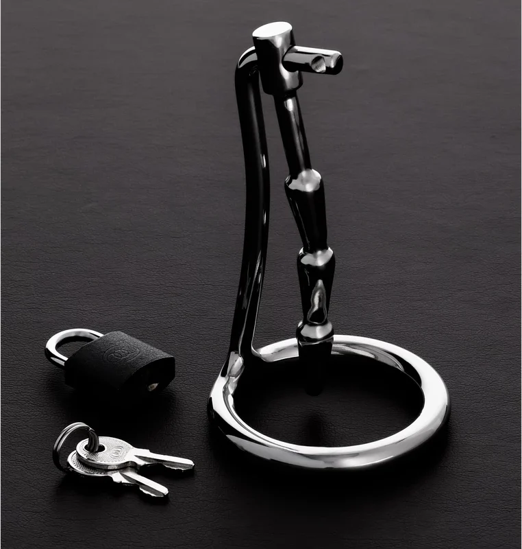 This device integrates a robust locking system, complete with a durable padlock, allowing for confident and reliable fastening. Its unique structure is meticulously fashioned to help manage and restrict physiological responses, offering a distinctive approach to personal control and restraint.