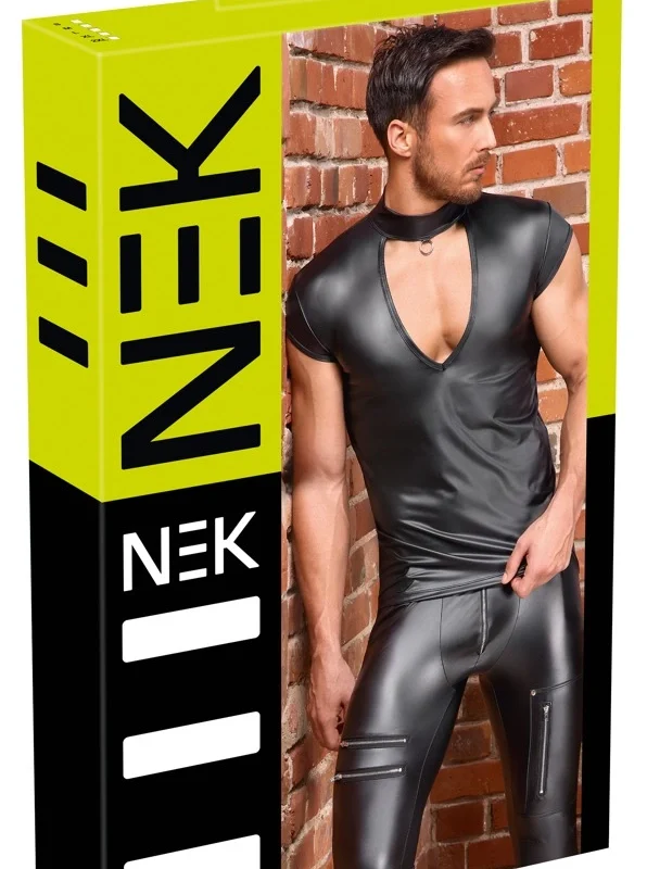 Discover modern style with the NEK Black Short Sleeve Shirt in size S, crafted to provide a distinctive, sleek appearance. This shirt combines a shimmering matte finish with an eye-catching V-shaped cut-out on the chest, all accentuated by a bold stand-up collar featuring a decorative metal ring. The carefully selected fabric blend ensures not only a skin-tight, anatomical fit but also exceptional comfort and flexibility throughout wear.