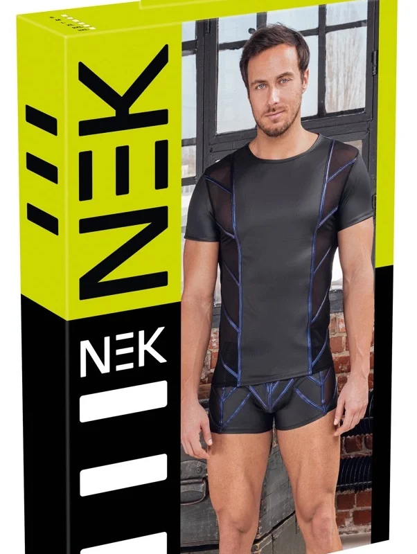 Šie modernūs vyriški NEK marškinėliai sukurti taip, kad išsiskirtų novatorišku medžiagų deriniu ir drąsiais dizaino elementais. Marškiniai yra aptakaus juodo matinės išvaizdos audinio, kurį sustiprina permatomos tinklinės plokštės šonuose. Šie tinkliniai įdėklai yra paryškinti ryškiomis įstrižomis juostelėmis, pagamintomis iš metalinio mėlyno matinio audinio, sukuriančio madingą ir šiuolaikišką išvaizdą.