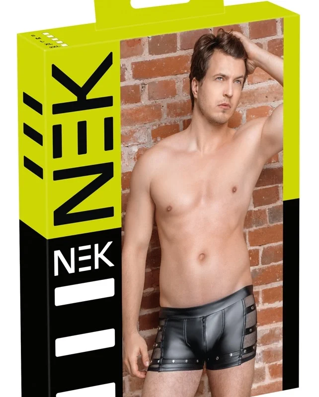 Experience a modern, statement-making design with these NEK men’s pants, crafted from a matte-look material that accentuates the silhouette. The sleek black fabric is complemented by unique transparent net inserts on each side, adding a contemporary edge. Decorative straps with metal studs overlay the mesh panels, providing an industrial-inspired finish that stands out in any wardrobe.