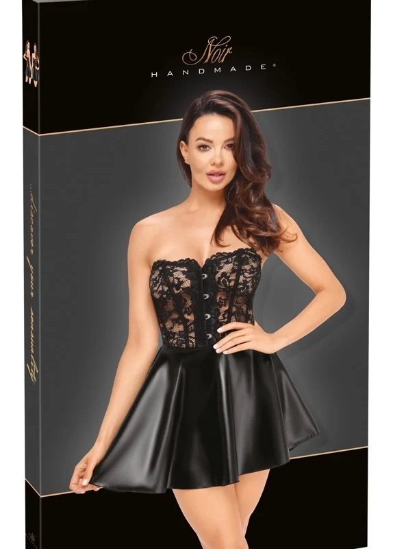 Discover contemporary elegance with the Noir Handmade Corset Dress in size M. This sophisticated little black dress harmoniously blends a delicate lace bodice with a striking powerwetlook skirt, creating a refined, modern silhouette that stands out in any setting.