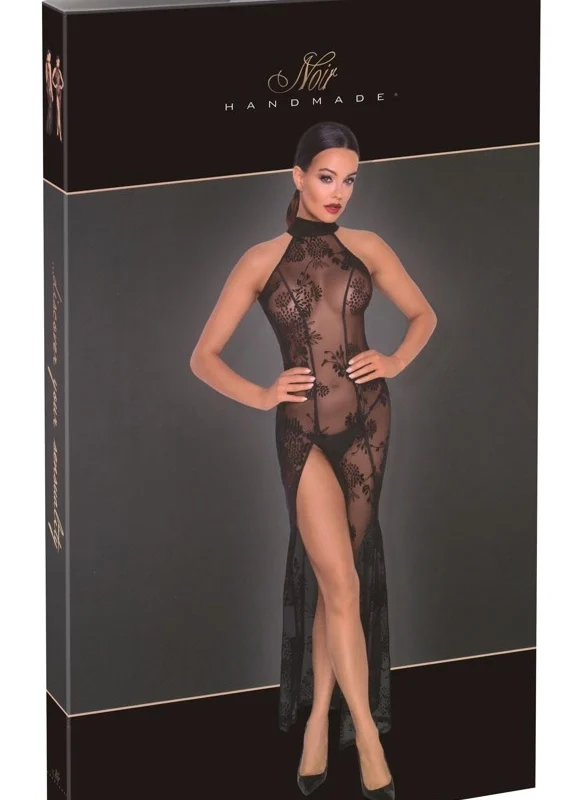 Discover sophisticated style with the Noir Handmade Long Dress in size L, designed for those who value refined fashion and contemporary elegance. Crafted from high-quality, stretchy powernet, this dress is adorned with a delicate velvet flock print in an ornate floral pattern, ensuring both comfort and a visually stunning effect. Its form-fitting cut beautifully accentuates the silhouette, while the sleeveless design and high front slit add a modern, bold touch.