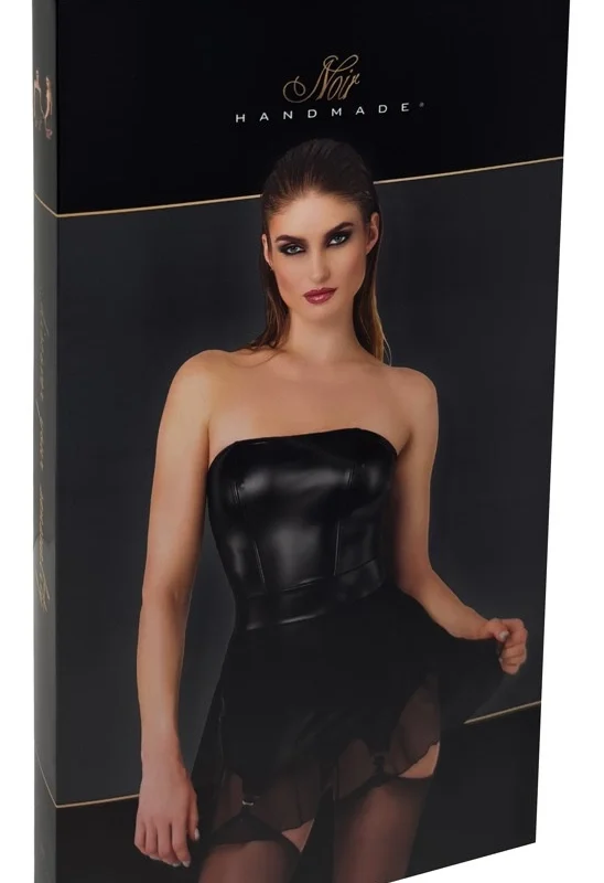 Step into sophisticated style with this striking Noir Handmade dress. Featuring a modern strapless design, this model uniquely combines a powerwetlook corset with elegant suspender straps and a delicately flared, light tulle skirt. The securely sewn tulle overlay adds visual intrigue, while the shaping seams and defined waistband highlight the silhouette for an impressive, tailored effect.