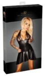 The top section is accentuated with glossy vinyl details, seamlessly blending into the powerwetlook skirt. The design is backless with an adjustable halterneck tie, providing both a secure fit and easy adjustability. A full-length two-way zipper runs from the neckline to the hem at the front, allowing for versatile styling and effortless dressing.