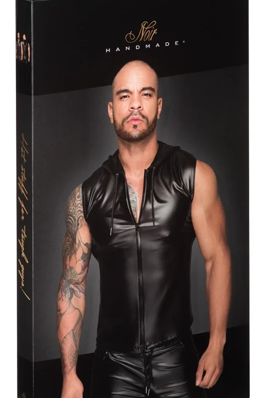 Upgrade your wardrobe with this contemporary sleeveless hoodie from Noir Handmade, designed for those who appreciate high-quality materials and a modern aesthetic. Crafted from Noir’s signature black powerwetlook fabric, this top features a soft, elastic texture that ensures a close, anatomical fit while providing maximum comfort throughout the day. The hood is made from gentle jersey material and equipped with an adjustable drawstring, offering both style and functionality. A full-length front 2-way zipper allows for customized wear and easy dressing.