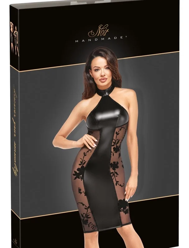 Step into sophisticated elegance with this knee-length dress from Noir Handmade, expertly crafted to blend modern aesthetics with luxurious comfort. The unique combination of matte, shiny powerwetlook material and delicate, velvet-flocked mesh side panels creates a striking visual contrast, giving the dress an exclusive, fashionable edge.