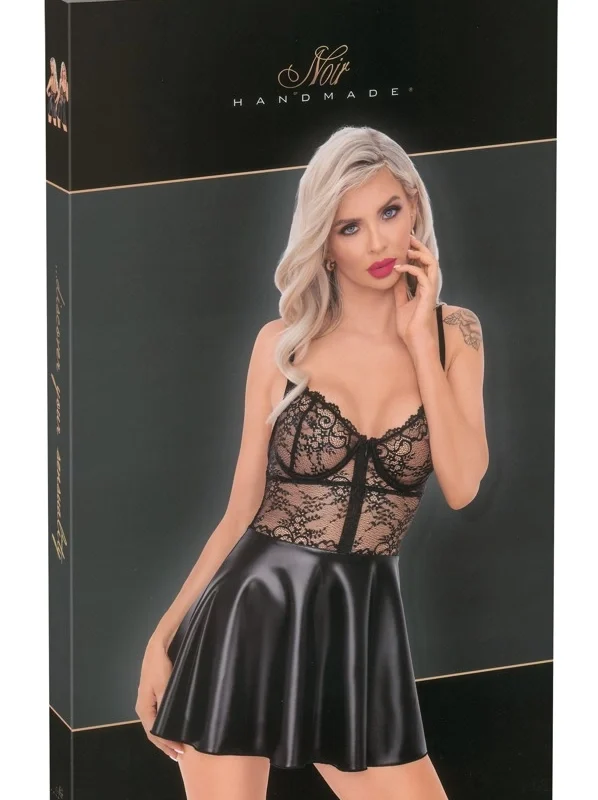 This exclusive black dress is crafted from a combination of delicate, floral lace in the upper section and a sleek, power wet look material in the skirt, creating an eye-catching, modern silhouette. The design features a fitted lace bodice with supportive underwired cups, offering a flattering shape and enhanced comfort. The adjustable shoulder straps ensure a precise fit tailored to your preference.