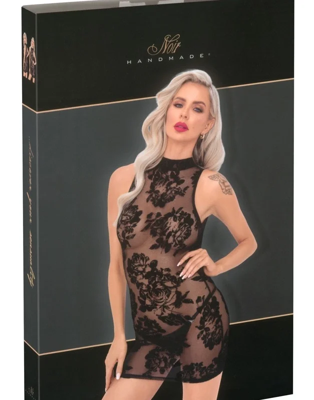 Discover an exceptional piece from Noir Handmade, crafted to combine elegance and comfort. This mini dress is made from delicate, semi-transparent tulle fabric with a beautiful flocked velvet floral motif, ensuring a refined and exclusive look for special occasions or intimate moments.